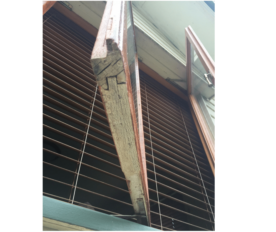 This is a photo of a typical casement window (underside of window view) which you will find in most post-war homes in Brisbane. I always look at timber windows carefully as they can be expensive to repair. This is what appears to be a cedar window and has been painted underneath in white paint to provide protection from moisture but the exterior face of the window has been clear lackered. You can see that the underside of the window has been forgotten about and is in need of immediate attention as the joints have separated. You know what they say “out of sight, out of mind”.  In saying that, the exterior of the window which is constantly exposed to weather conditions is also in poor condition and bare timber is now exposed to the elements. What a lot of people may not know is that although clear lackered timber looks fantastic it requires constant maintenance and these windows need light sanding and have a single clear coat applied every 2-3 years to keep them looking great. Once the bare timber has been exposed, ideally the timber should be stripped back, requiring moderating sanding and 2-3 coats of clear reapplied again.
